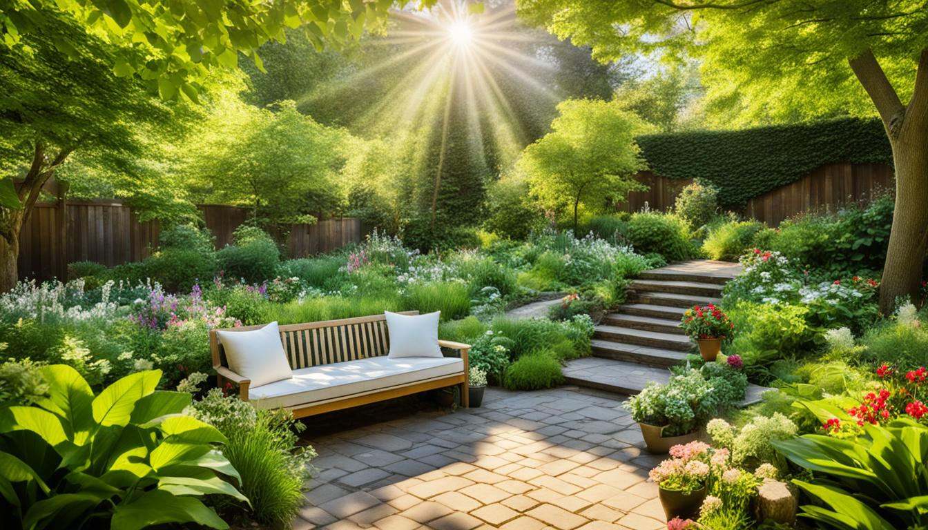 When designing your garden oasis, it’s key to make seating areas that invite relaxation and fun. Outdoor furniture is crucial for these cozy spots. Choose from plush lounge chairs, sturdy benches, or cozy sectional sofas to make your backyard a serene retreat.