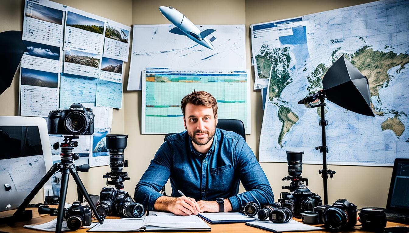 Creating a detailed photography plan is key to making the most of your time and getting great shots. Begin by spotting where you can take amazing photos, thinking about lighting, what you want to capture, and how to arrange your shot. This way, you won’t miss out on the essential photos.